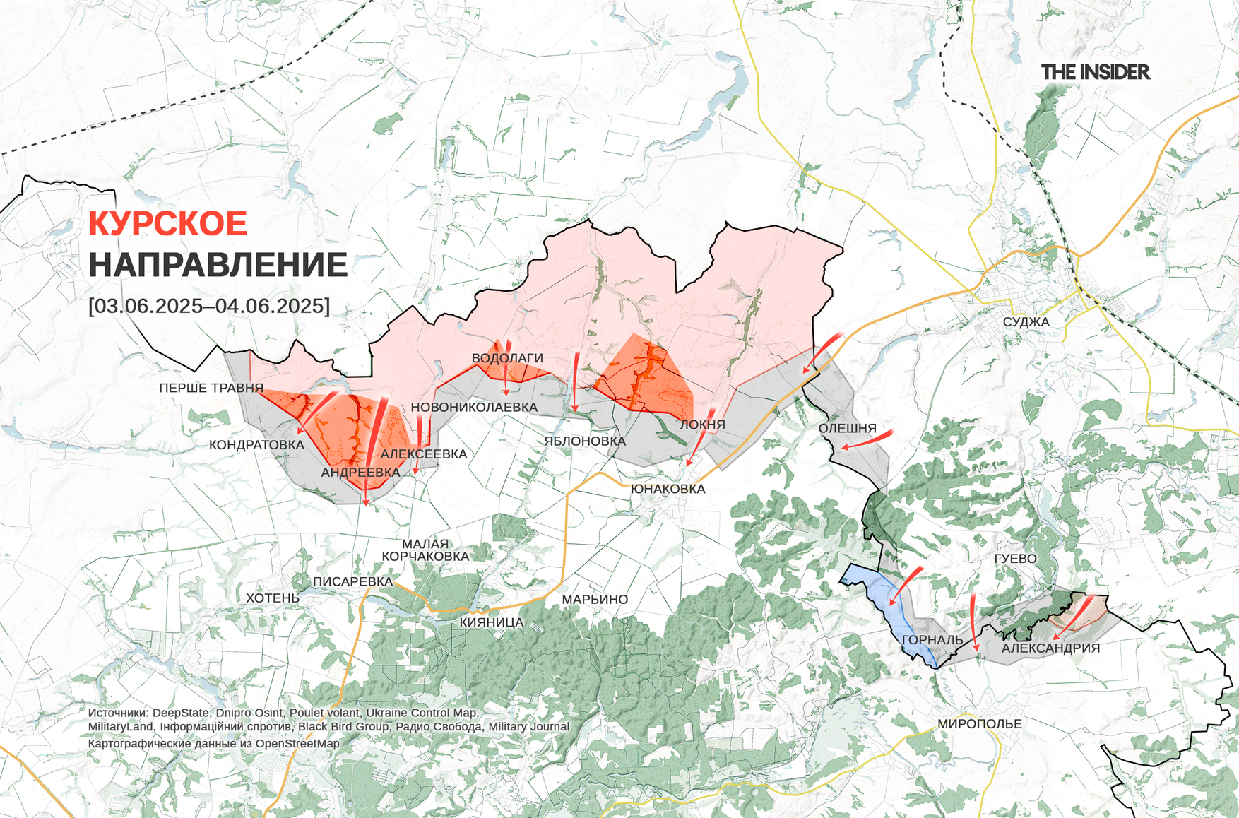 Минобороны РФ заявило о захвате села Кондратовка в Сумской области. В свою очередь, DeepState признал российский контроль над селами Андреевка (Минобороны РФ заявило о его захвате 3 июня) и Водолаги (по сообщению Минобороны РФ — занято 2 июня), а также констатировал продвижение ВС РФ около села Яблоновка. Телеканал RT выложил видео с российским «флаговтыком» в Водолагах (геолокация).