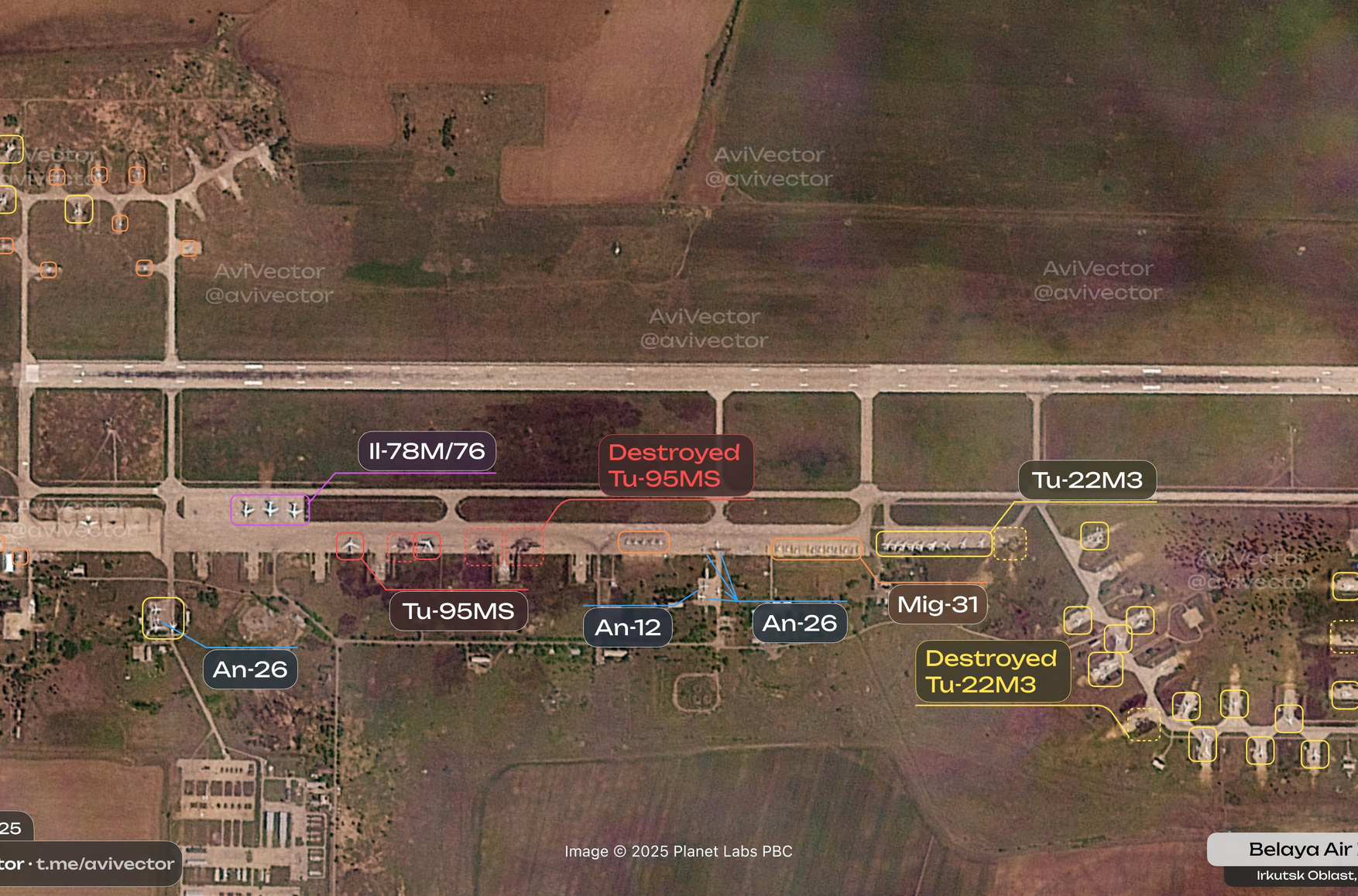После украинской операции «Паутина», в результате которой ВКС РФ потеряли до 20 стратегических бомбардировщиков, Минобороны России перебазировало бомбардировщики Ту-160, Ту-95МС и Ту-22М3 с аэродромов в Иркутской и Мурманской областях на другие авиабазы — преимущественно на Дальнем Востоке. Об этом пишет украинский OSINT-проект AviVector со ссылкой на спутниковые снимки.
