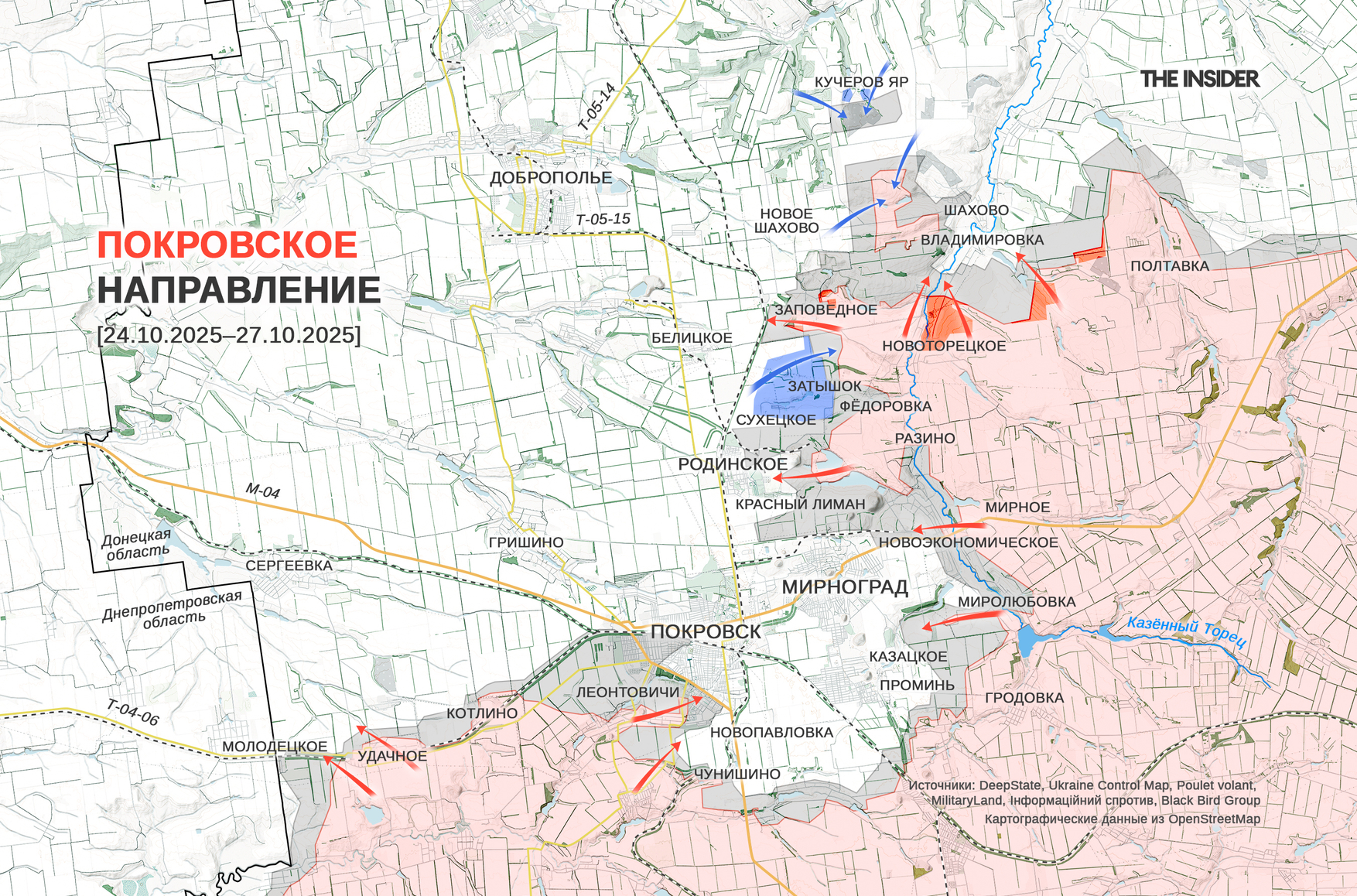 Константин Машовец рассказывает (1, 2, 3, 4), что две недели назад российская 2-я общевойсковая армия получила от 6 до 10,5 тысячи человек подкреплений для проведения очередного штурма Покровска, а соседняя 51-я армия перенесла свои основные усилия в район Мирнограда. Кроме того, в штурме принимают участие силы до одной мотострелковой бригады из состава 41-й армии. В ходе штурмовых действий им удалось войти в Новопавловку и прилегающие к ней с севера районы Покровска, а также существенно продвинуться в центре города, «просачиваясь» группами от 3–5 до 8–10 человек, которые лишь изредка вступают в бои с украинскими военными. Такая тактика вносит хаос в оборону СОУ, которые в результате уверенно контролируют только северные районы Покровска. Машовец сообщает, что ВС РФ удалось перерезать дорогу на Павлоград и сузить горловину «кармана» до 9 км. В то же время, по его сведениям, силам 51-й армии пока не удается закрепиться в Мирнограде. Машовец считает, что бои за Покровско-Мирноградскую агломерацию вступили в завершающую фазу, а угроза окружения обороняющейся здесь группировки существует, хотя в настоящее время никакого окружения нет.