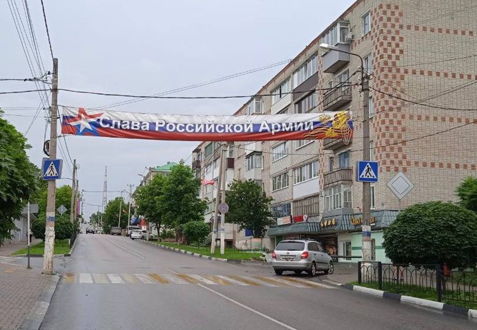 Первое, что бросается в глаза в Валуйках, — огромное, даже по сравнению с Белгородом, количество военной символики. Повсюду литеры Z и V. «Своих не бросаем» — на магазинах, машинах, одежде, школах и, конечно, военной технике.