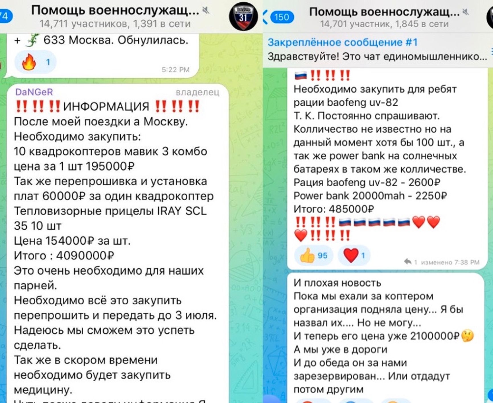 Если вначале собирали медикаменты, еду и предметы первой необходимости, то сейчас запросы от военных выросли. Почти все волонтёрские группы собирают дорогостоящую технику: квадрокоптеры за 1,5–2 млн рублей, коллиматорные прицелы и тепловизионные бинокли. Список на 4 млн рублей — не редкость.