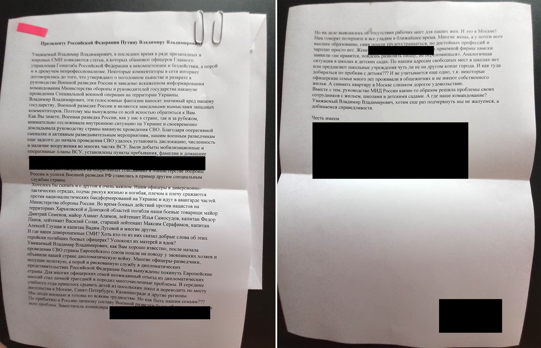 The Insider связался с некоторыми сотрудниками ГРУ, чьи фамилии закрыты «плашками» в жалобе, но они заявили, что никаких коллективных обращений к Путину не подписывали. А один предположил, что «это мутят воду не сами офицеры, а их жены».