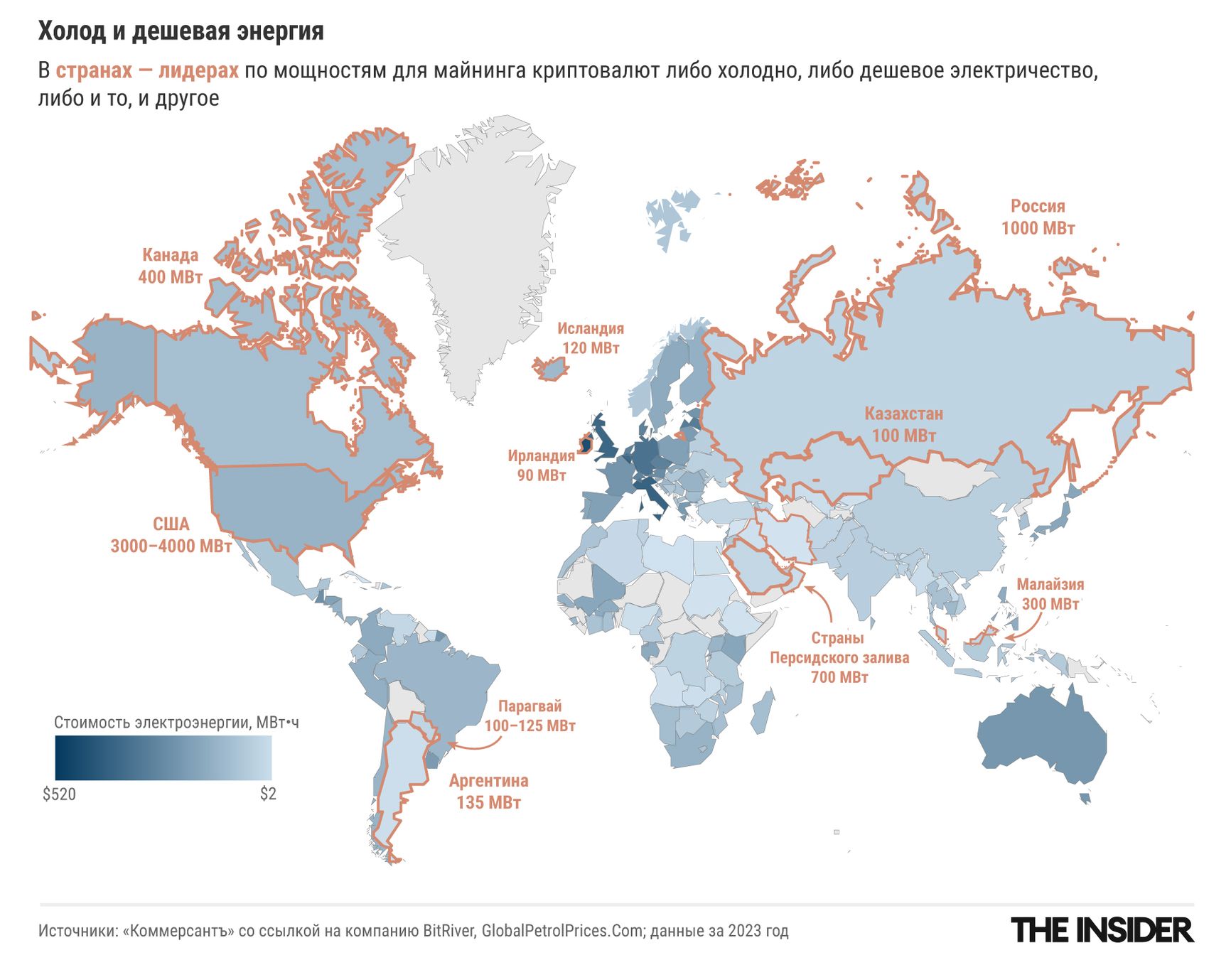 Добывать криптовалюту в России выгодно по нескольким причинам. Во-первых, отрасль еще законодательно не отрегулирована. Во-вторых, в стране низкие цены на электроэнергию. Наконец, помогает холодный климат, ведь оборудование нужно охлаждать. Действительно, за исключением США, в странах, попавших в топ по производству криптовалют, есть либо дешевая энергия, либо холодный климат, а чаще — и то, и другое: например, в Канаде и в Исландии цена на электричество ниже средней по миру и намного ниже европейской, а в Аргентине и электричество намного дешевле российского, и прохладная погода на юге страны держится круглый год.