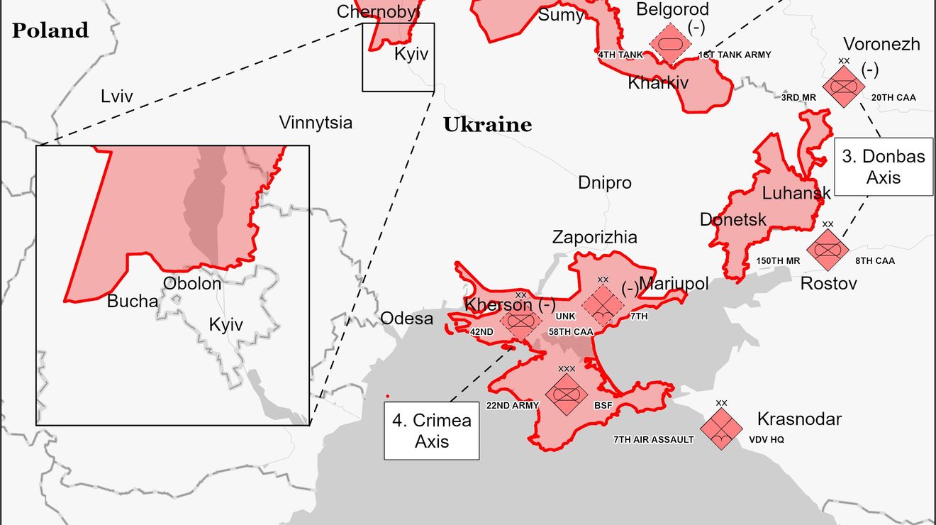 Продолжаются обстрелы Харькова, Чернигова, Одесской области (город Арциз). Российские войска продолжают наступление на Николаев. Российские войска в Херсоне. В направлении Запорожья они уже дошли до Васильевки и города Токмак. Если на этом направлении им удастся продвинуться на восток, вероятным может стать окружение Мариуполя. На севере заблокированными остаются Сумы и Ахтырка. Киев готовится отражать очередное наступление. Об этом уже сообщил его мэр Кличко.
