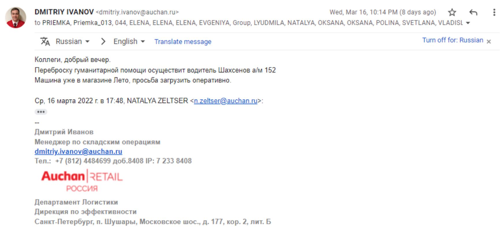 Отдел логистики в лице менеджера по складским операциям Дмитрия И. подтверждает собранное количество и автотранспорт, который ночью 16 марта доставит товары со склада и попутно заберет собранную «гуманитарную помощь» из магазинов «Ашан» Петербурга для перевозки в конечный пункт «Ашан Северный».