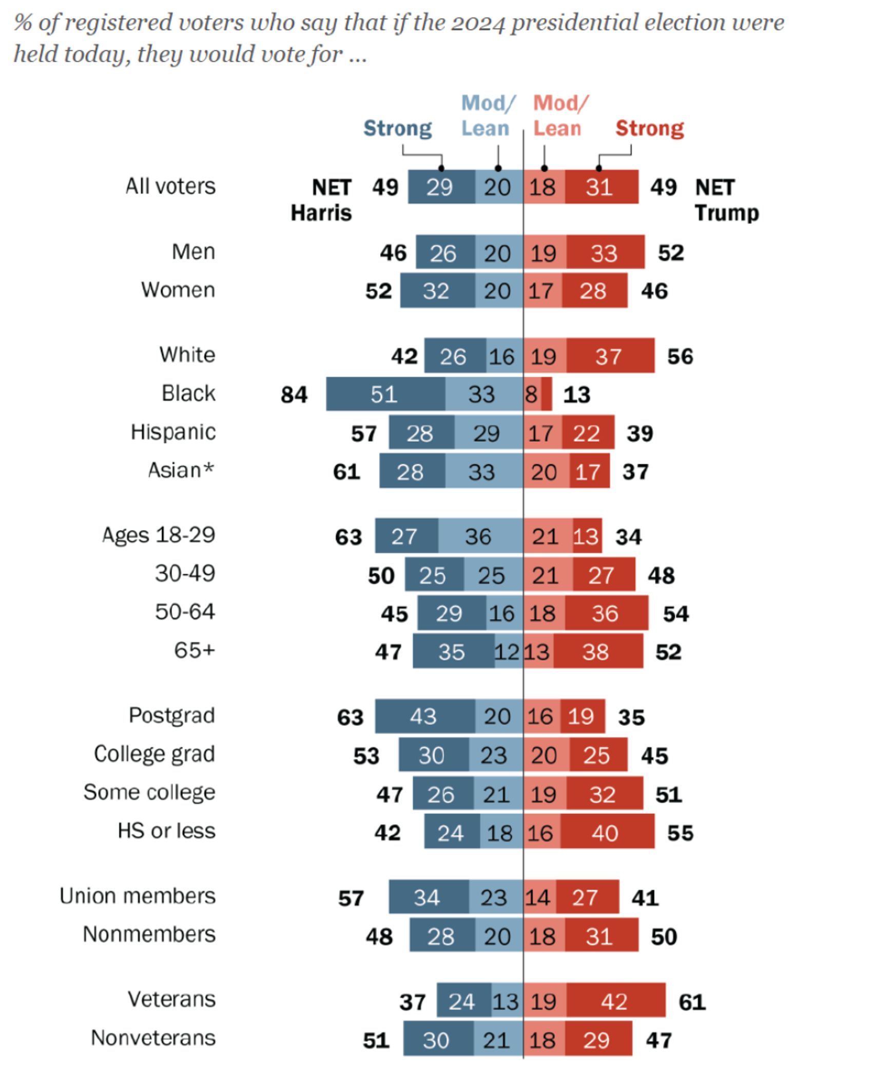 Это особенно важно в контексте президентских выборов, на которых явка всегда выше, чем на промежуточных выборах в Конгресс за счет участия менее информированных и более аполитичных избирателей. И некоторые опросы показывали, что самая высокая поддержка у демократов была среди тех, кто голосовал на прошлых промежуточных выборах и партийных праймериз, а у республиканцев — среди тех, кто ходил лишь на прошлые президентские выборы либо пропустил и те, и другие выборы.
