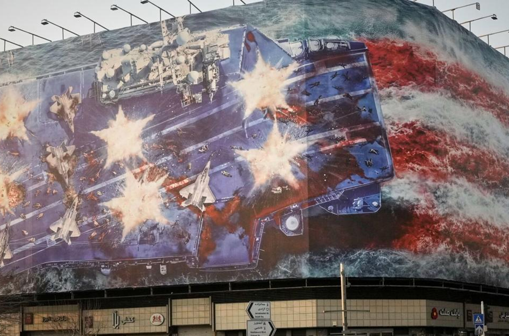 Тем временем в Иране грозят «глобальным джихадом» в случае попытки американцев убить высшего руководителя Али Хаменеи и представили публике впечатляющий мурал, изображающий поврежденный и оставляющий за собой кровавый след американский авианосец (цветовая гамма и расположение отдельных элементов напоминают флаг США), с надписями на фарси и английском: «Кто посеет ветер, пожнет бурю». Союзники Ирана хуситы пошли еще дальше и опубликовали анимационный ролик с ударами по «Аврааму Линкольну».